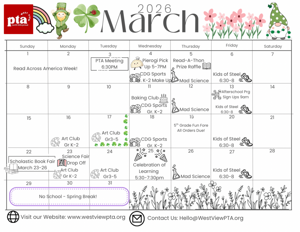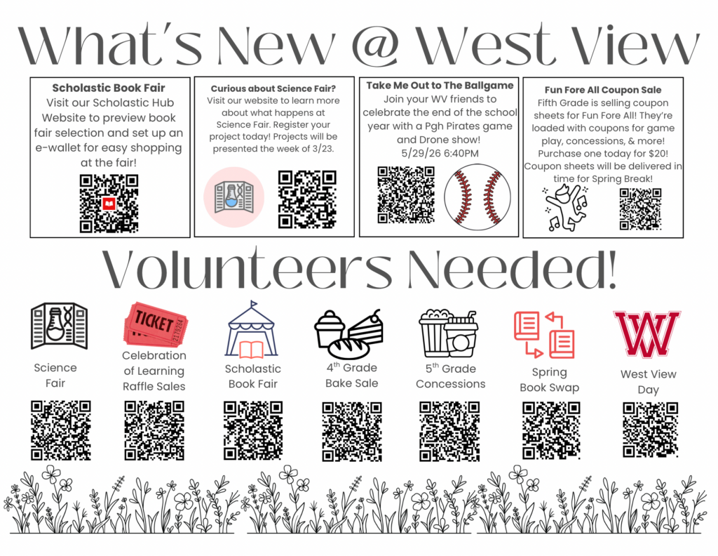 The West View Science Fair will take place March 23-25, including the evening of the 25th during the school’s Celebration of Learning. Our Science Fair Committee has plenty of resources to get you started on your project journey! Don’t miss out on this favorite West View tradition!