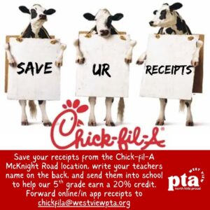 Anytime you purchase food from Chick fil A McKnight Road, 20% of your purchase could be coming back for the West View Elementary PTA to use to help defray costs for our 5th Grade.